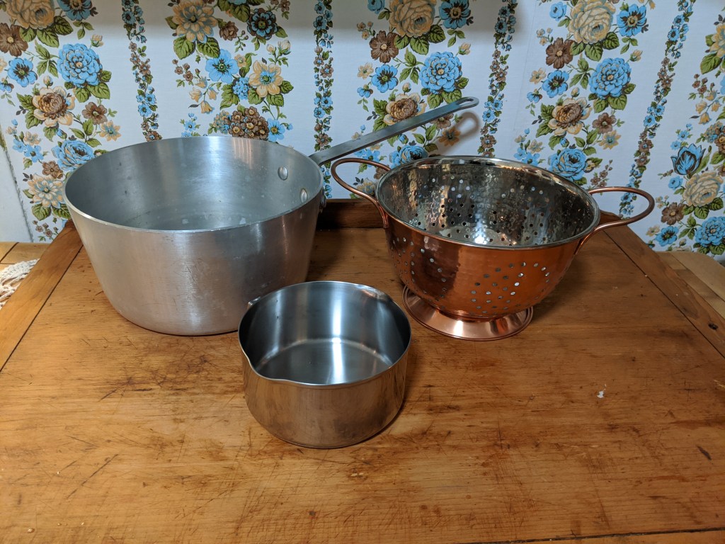 Lg/Med size pot, Strainer, Small Pot (with spout if possible)
