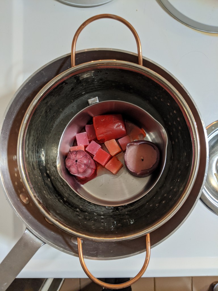 OR, cut chunks or cubes of unmelted wax and stack inside of container. Creates a neat pattern you can see from the outside (more easily seen through clear glass)