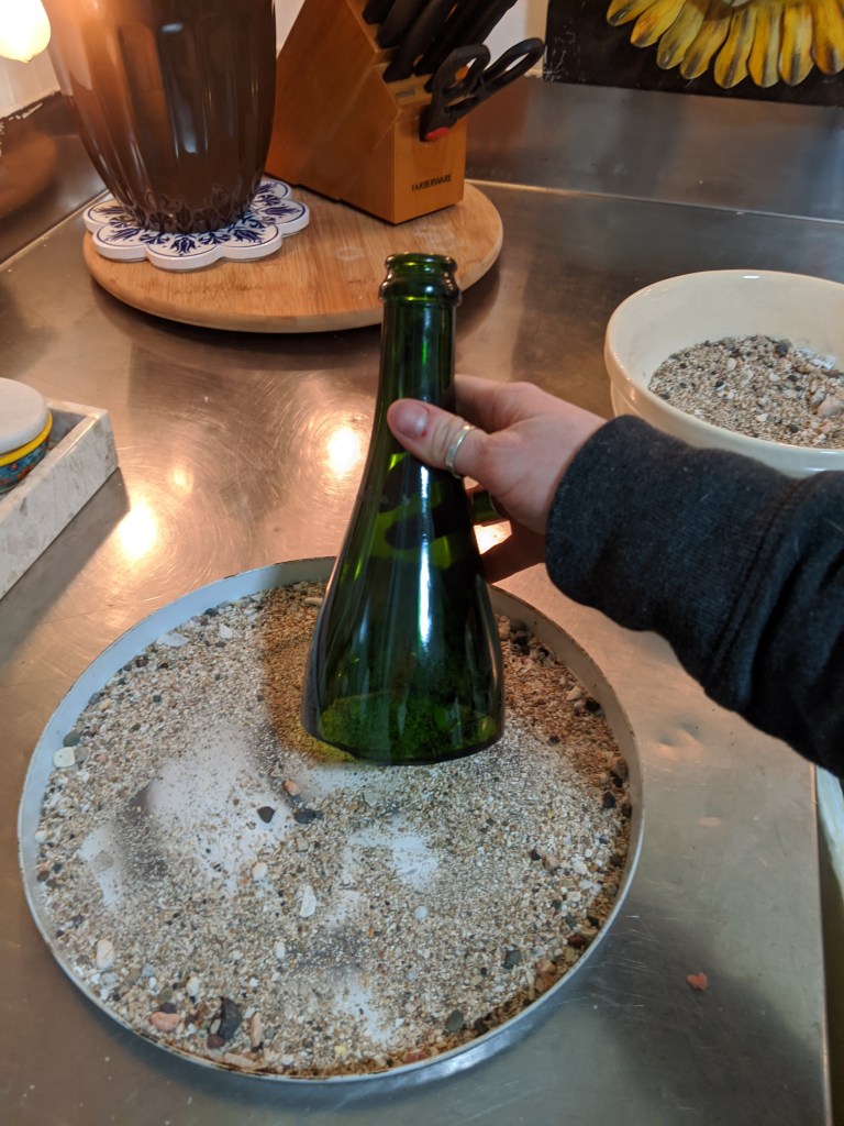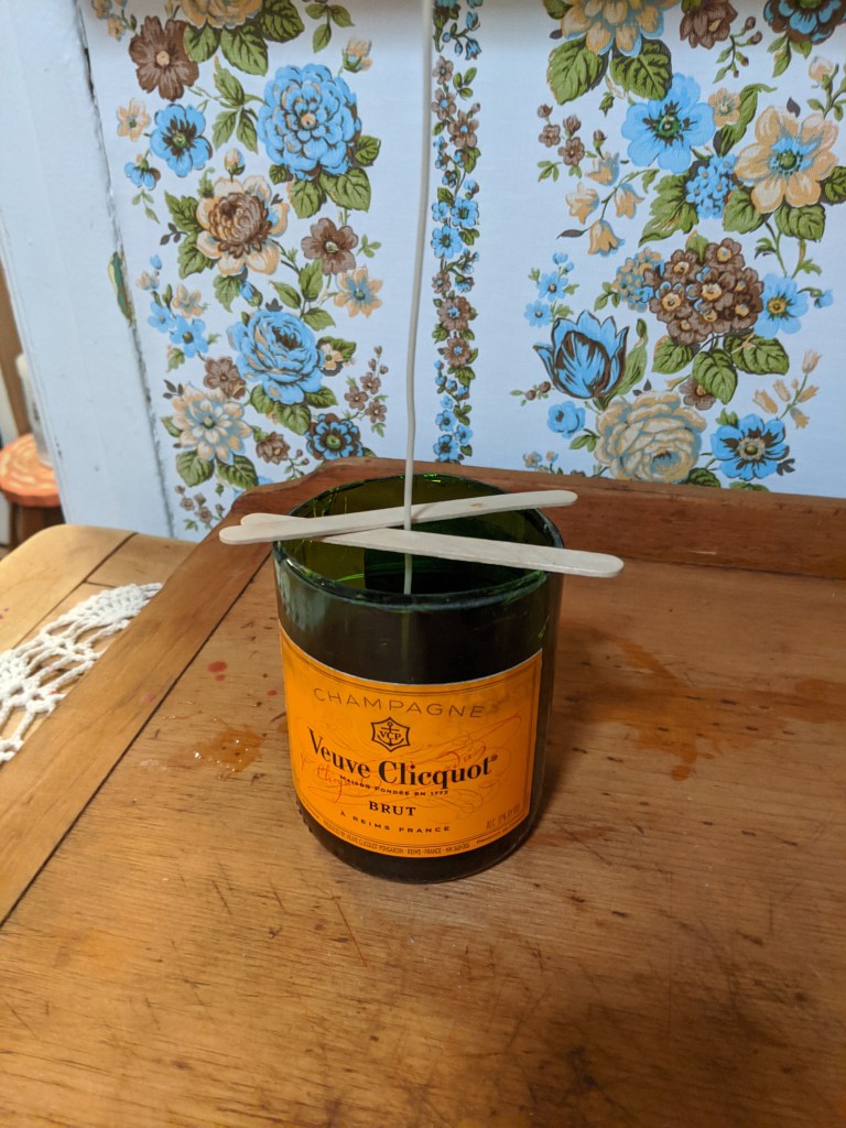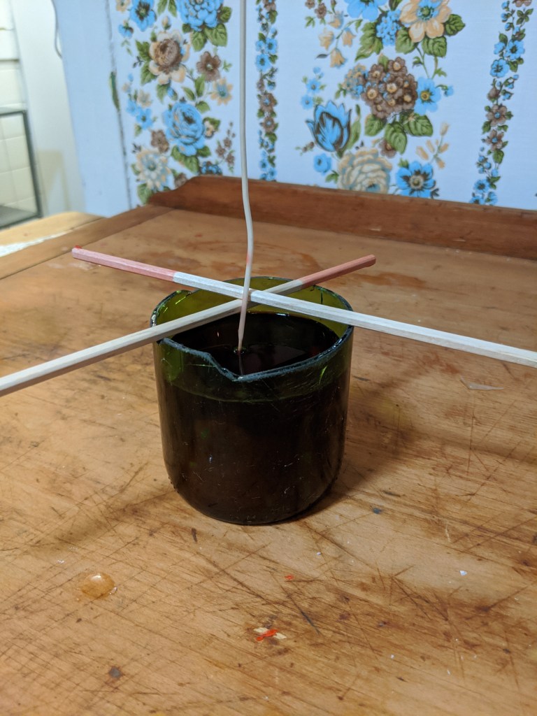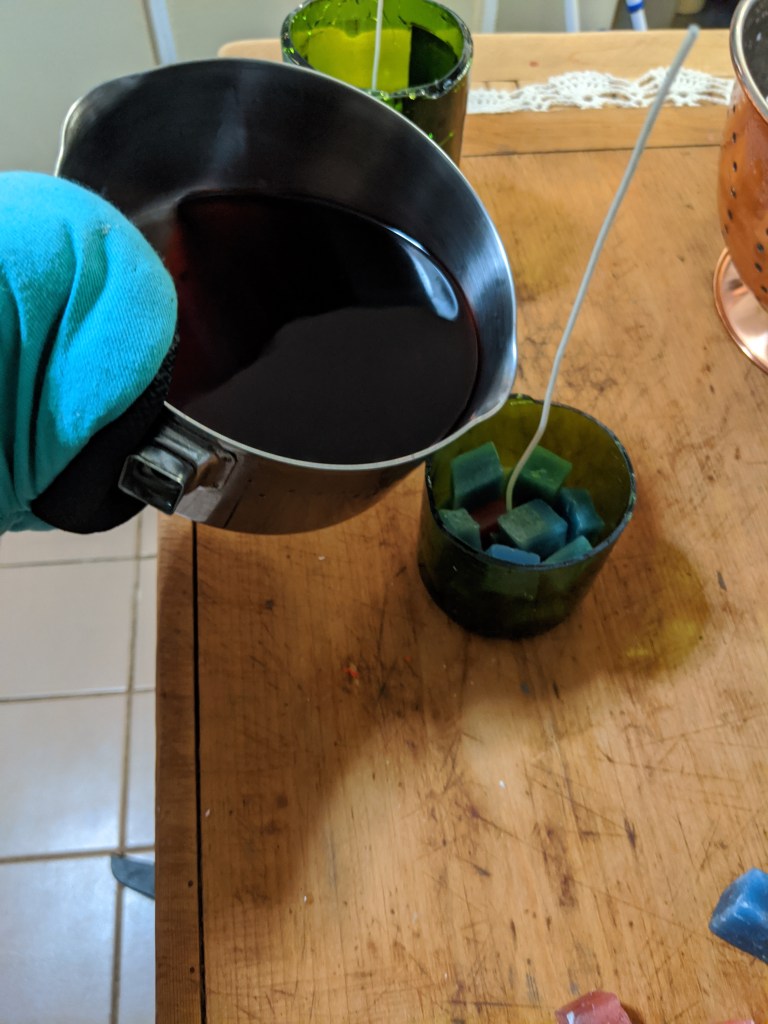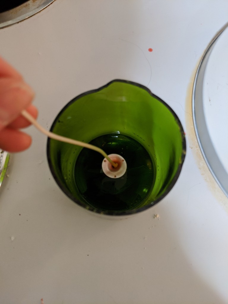 Using oven mitt, take the small pot of wax and slowly poor into the bottle