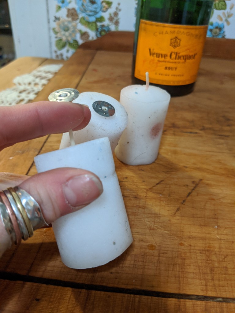 Pull the wick out of a votive candle you have already and use the wax to make a new candle….