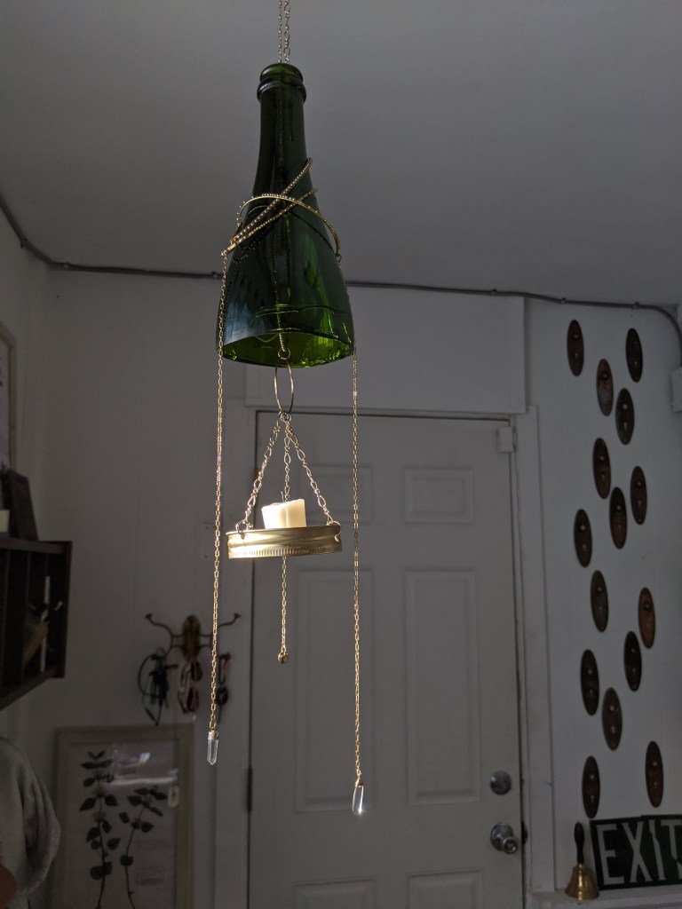 - Secure with chain pieces (I used metal clasps and rings from old jewelry), and attach/suspend from chain running through the bottle.