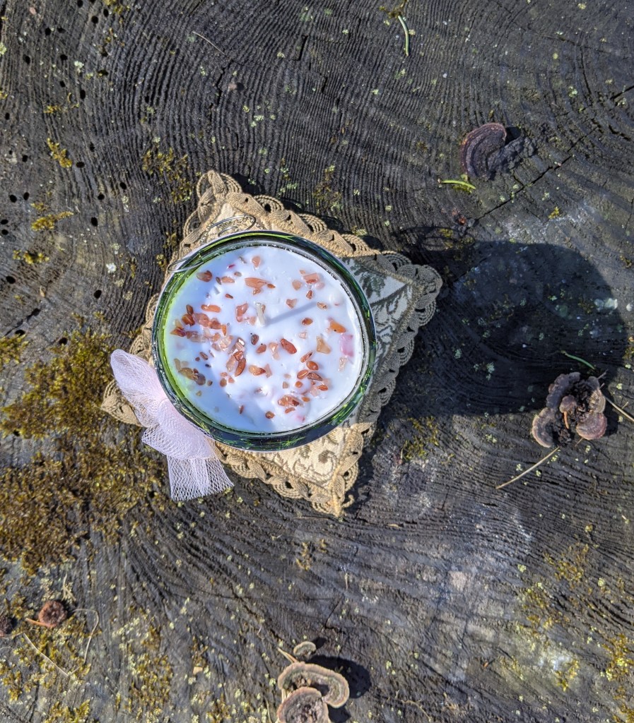Just before top of candle dries, sprinkle in stones, sand, or shells (optional)