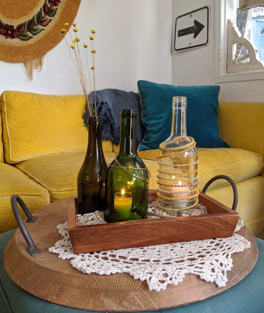 I put bangles around the outside of the neck of the bottle. Then suspended chain and charms from the bangles at different heights.