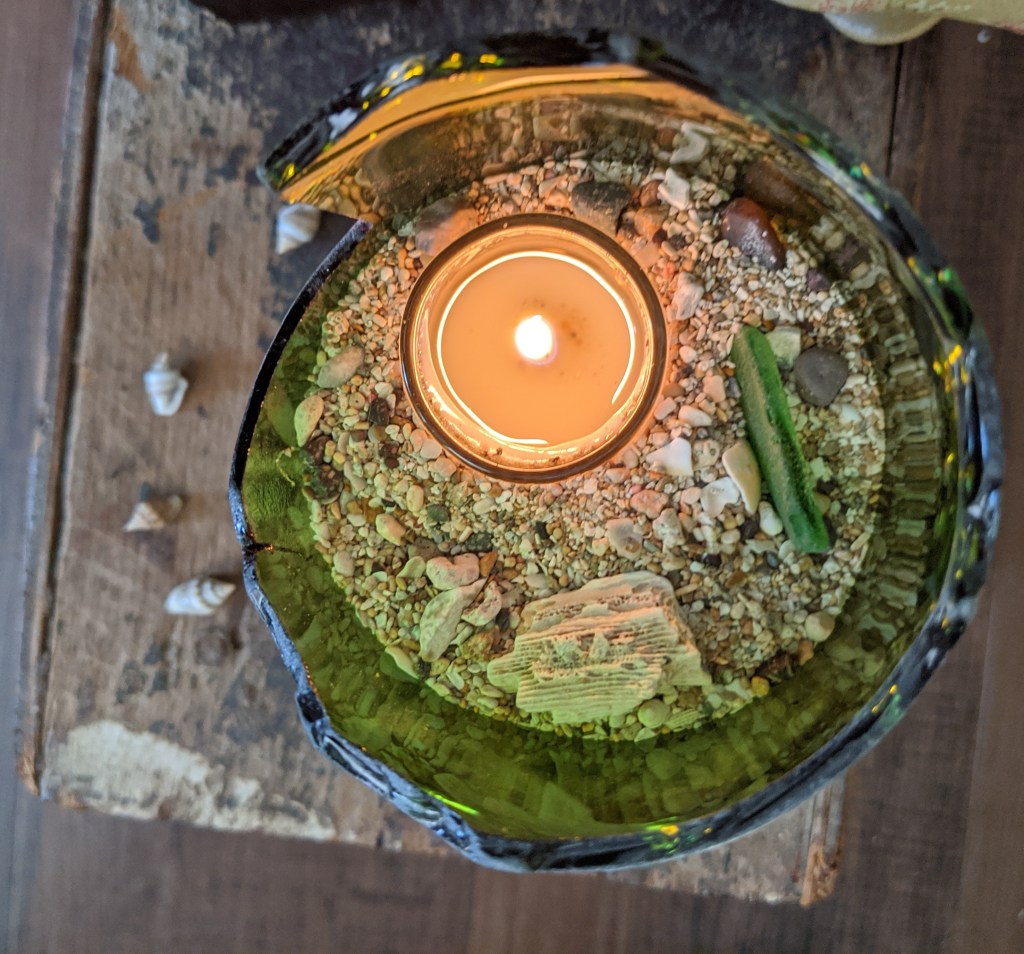 - Fill with sand, marbles, shells, etc… Place tealight inside.